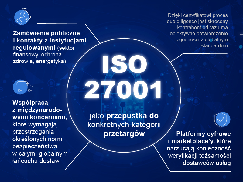 W sektorze B2B certyfikat ISO 27001 stanowi przepustkę do konkretnych kategorii przetargów. Dotyczy to w szczególności: